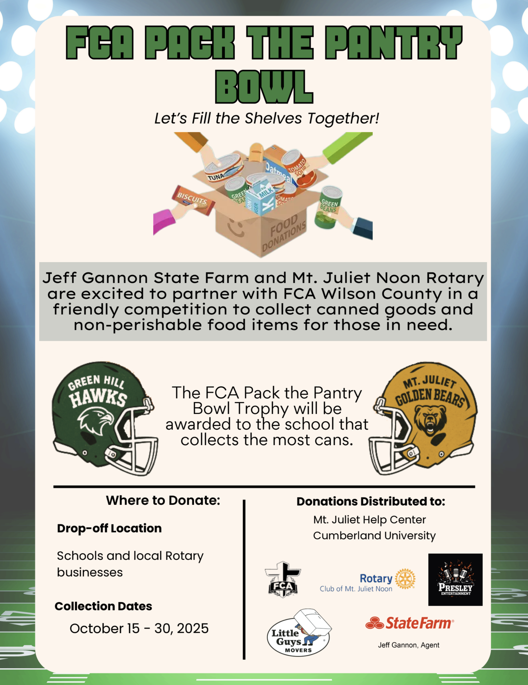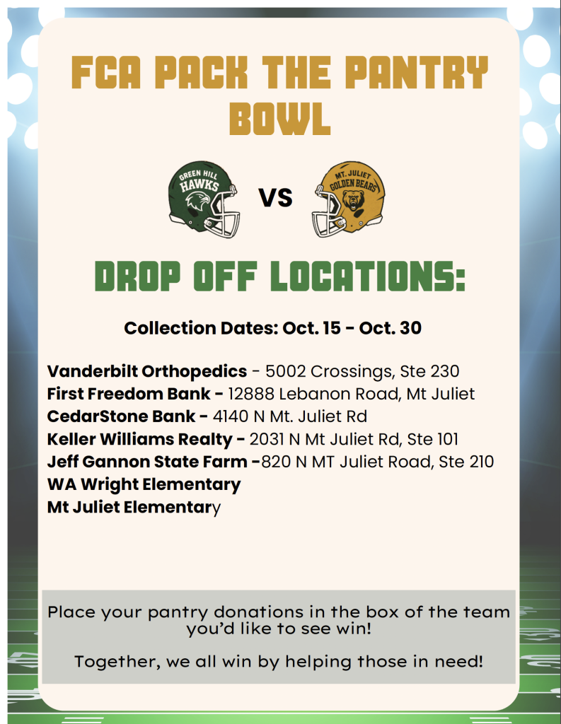 The Green Hills Hawks & the Mt. Juliet Golden Bears are competing in a canned food donation drive. The Mt. Juliet Noon Rotary Club is helping out with the event hosted by Jeff Gannon’s State Farm Insurance and the Fellowship of Christian Athletes. You can drop off donations at the CedarStone Bank Mt Juliet Branch at 4140 N. Mt. Juliet Rd until October 30th.
